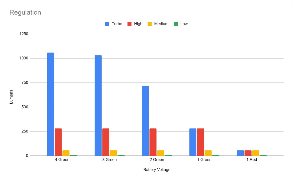 Regulation performance is mediocre. Turbo is significantly affected by battery voltage. The other modes aren’t affected until the battery’s effectively empty. I only tested with the included battery. Other supported batteries will provide different performance numbers.