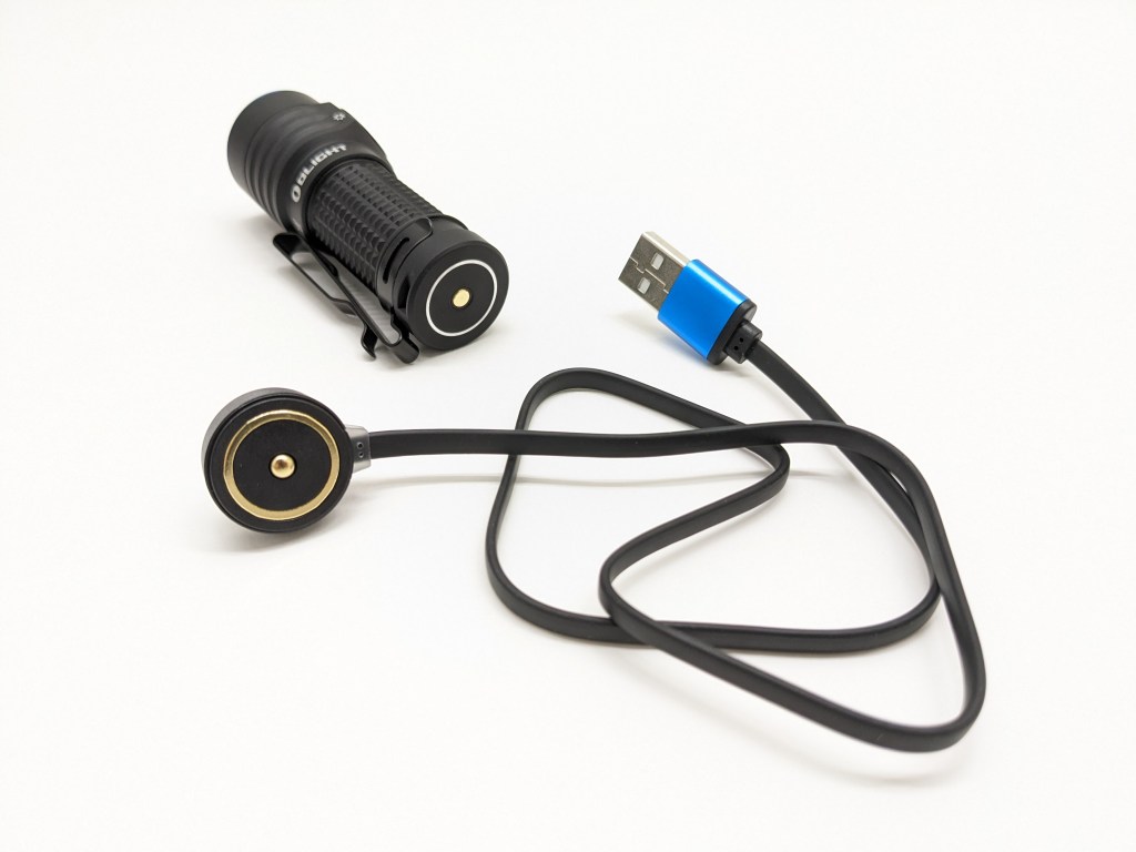 Charging is facilitated by Olight’s magnetic charging system. There’s a cable included with USB-A on one end and a magnetic puck on the other. That magnetic puck and tailcap have mating charging contacts and snap together magnetically. It’s very convenient if you always charge in the same spot, but it’s a special cable you have to bring when you travel. The charging only works with Olight’s proprietary batteries. Charging takes about 70 minutes. It’s fully functional while charging, but the battery has to be installed.