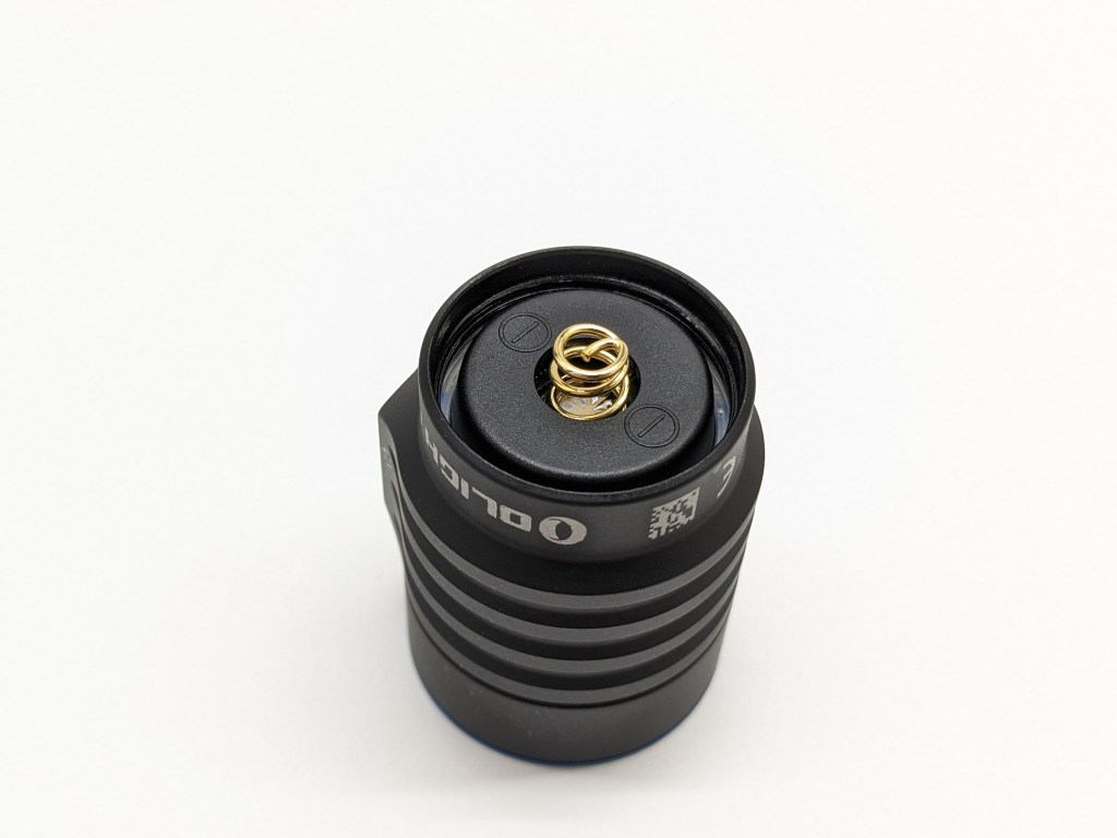 The battery included is a proprietary Olight-branded 18350 cell with an 1100mAh capacity rating. It does a fine job powering this light, but a lower-capacity higher-discharge cell would probably help the regulation performance. It goes in “backward” with the negative end toward the head.