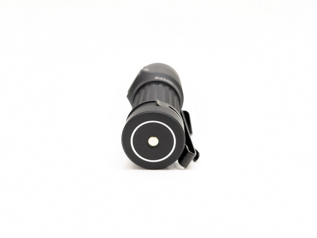 A magnet is embedded in the tail cap to facilitate magnetic charging and allow you to stick the light to ferrous surfaces. It’s plenty strong to hold the light up on a vertical surface. The charging contacts are exposed so it would be wise to keep it away from metal shavings.