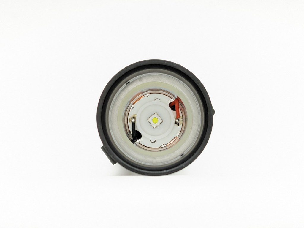 Olight doesn’t publish emitter details, but I think this is a Luminus SFT25R. It’s a hot new emitter with a small, round die for lots of throw. The color properties aren’t great, but it does a great job in this light. It also appears to be on a standard 16mm MCPCB, so swaps should be easy.