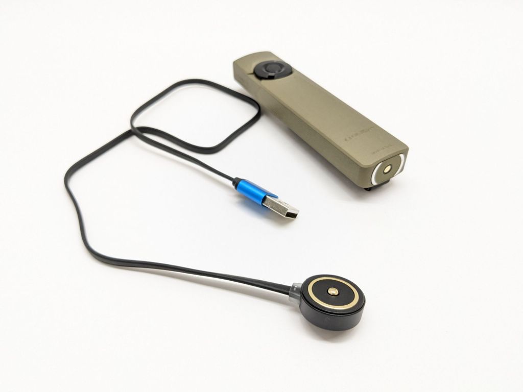 Charging is facilitated by Olight’s magnetic charging system. There’s a cable included with USB-A on one end and a magnetic puck on the other. That magnetic puck and tailcap have mating charging contacts and snap together magnetically. It’s very convenient if you always charge in the same spot, but it’s a special cable you have to bring when you travel. The charging only works with Olight’s proprietary batteries. Charging takes about an hour and 10 minutes. It’s fully functional while charging.