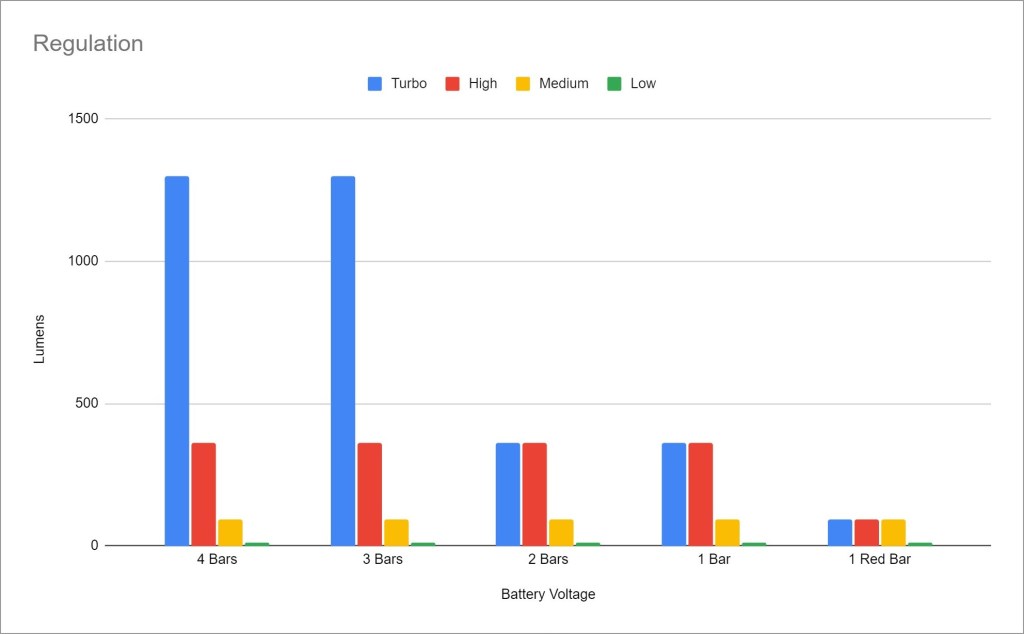Regulation performance is disappointing. I like when lights can reach full Turbo brightness down to ~25% charge but this one can only do it when the battery is more than half full. Below that, Turbo doesn’t just get dimmer like on most lights, you lose Turbo completely. Not good.