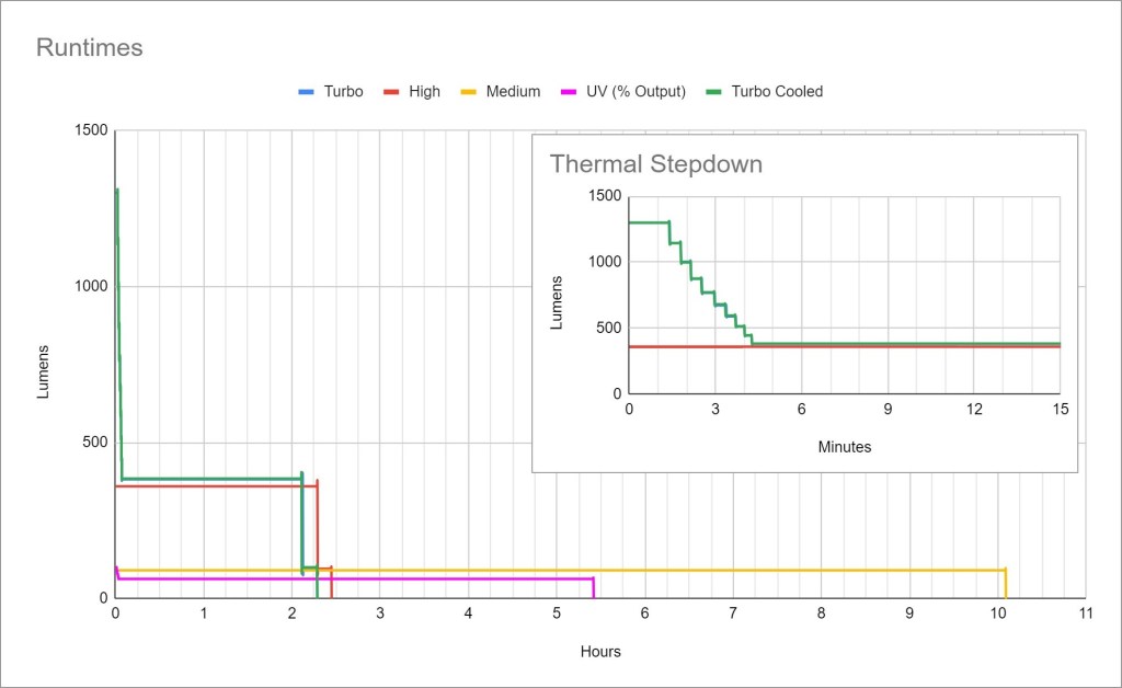 Performance: Turbo time is only 1.5 minutes (half of Arkfeld Pro’s Turbo time), and that’s odd. After that, the performance is virtually identical to Arkfeld Pro. Stable output is about 400 lumens for about 2 hours. That’s a bit conservative but still plenty bright. UV output steps down a bit in the first few minutes but then it’s perfectly flat for the rest of the test.