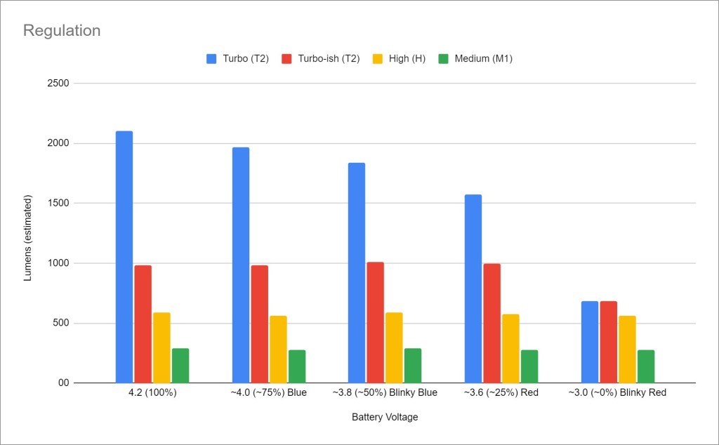 Regulation performance is good/average. It maintains most of the Turbo brightness down to ~25% charge, and all the other modes are flat down to ~25% charge or less. That’s exactly what I want because it shows the components are high quality and they’re being pushed hard for great performance.