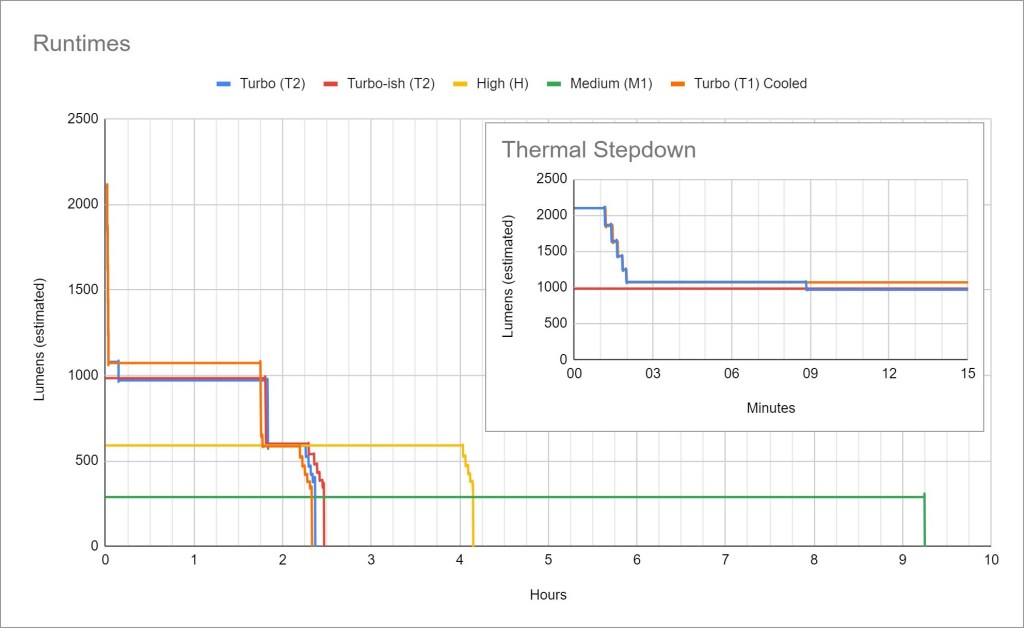 Performance is satisfactory and in line with the competition. Sustained output is about 1000lm for a little under 2 hours.