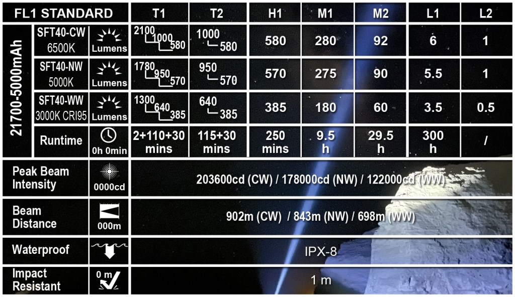 | Level | Lumens (estimated) | Candela | Throw (Meters) | CRI (Ra) | Color Temp. (K) | DUV (Tint) |
