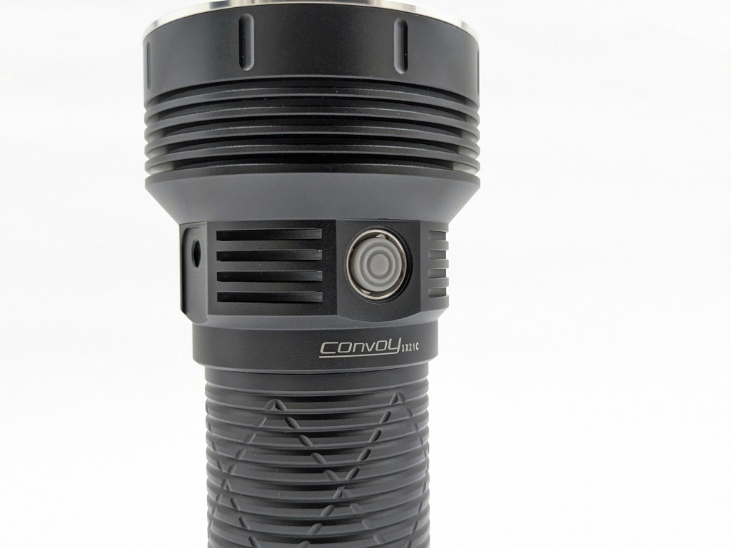 3X21C has an electronic side switch with a grey silicone boot. It’s clicky and tactile, but it can take a moment to find in the dark. There are LEDs under the switch to indicate charging status. I like side switches on large lights because they’re easy to access in most grips and provide full control over the light with one hand.
