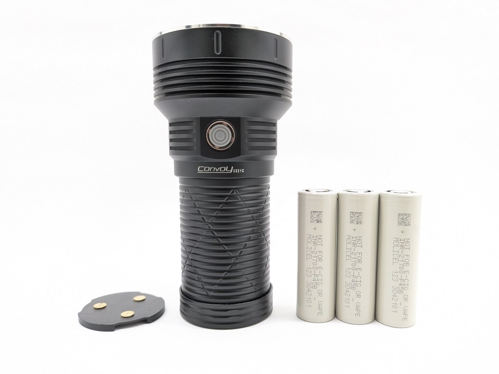 The batteries are optionally included, and Convoy offers several to choose from. I chose Molical P45Bs for their high drain and relatively high capacity. They do a great job here. A spacer is included for using flat-top cells. Any unprotected 21700 cell should fit, button or flat-topped. Be careful not to insert any of them backwards as that risks creating a dangerous short circuit. That’s why most competitors require button-top cells, to avoid short circuits.
