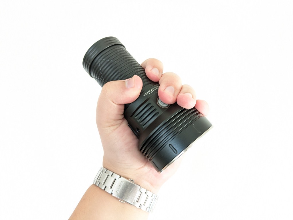 Ergonomics are good. It’s comfortable to hold and in a forward or neck grip. My only complaint is the milling on the body tube isn’t as grippy as I would like (nor as grippy as my 3X21D tube). It works well in a forward grip with my thumb on the button or in a neck grip with my middle finger on the button.