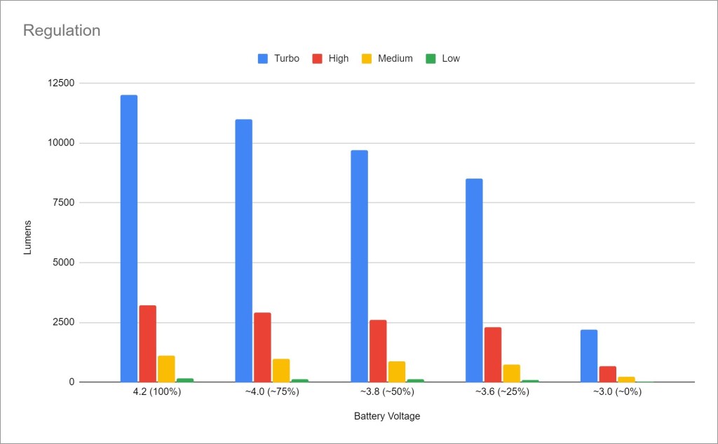 Regulation performance is below average. That’s to be expected from a FET driver like this. Every mode is affected by battery voltage, but you probably won’t notice until the battery is virtually empty. Note: Since posting this review, 3X21C has been updated to have a Buck+FET driver which should improve runtime and regulation performance in every mode except Turbo.