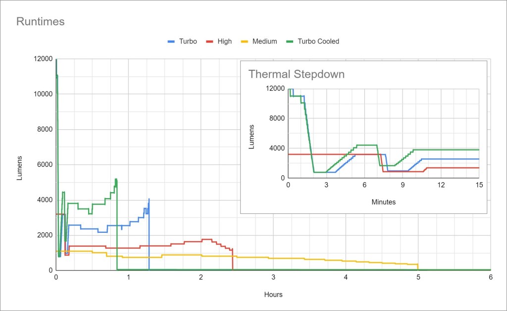 Thermal regulation: My Turbo, Turbo Cooled, and High tests are all markedly different, so there is active thermal regulation. It only seems to kick in after the initial timed stepdown though. My Turbo test had a fan circulating air in the room, while the Turbo Cooled test had the fan pointed directly at the light.