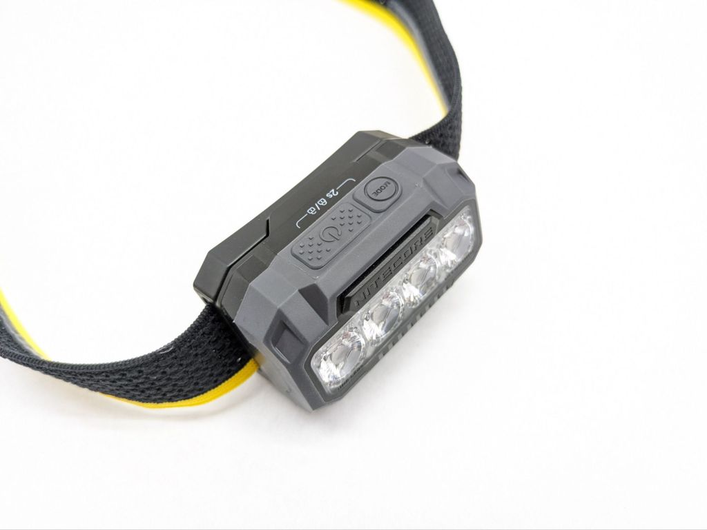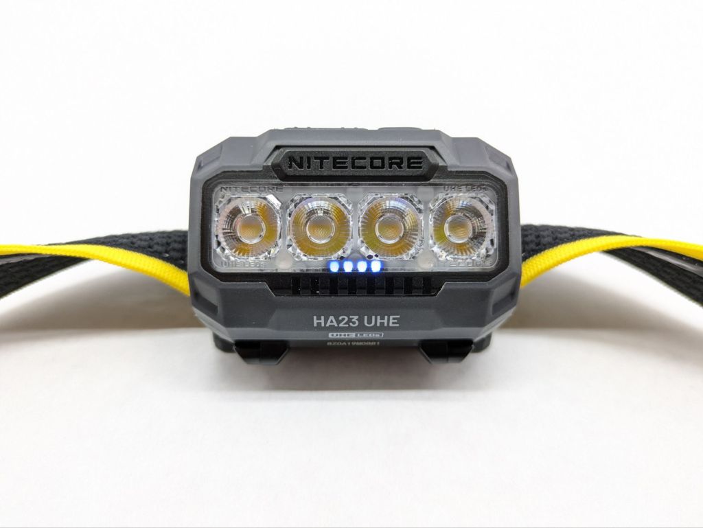 The battery indicator is a set of four blue LEDs on the front of the headlamp. Press the mode button to activate them for a few seconds. Four-LED indicator systems like this are my favorite because they’re intuitive, glanceable, and measure in even 25% increments.