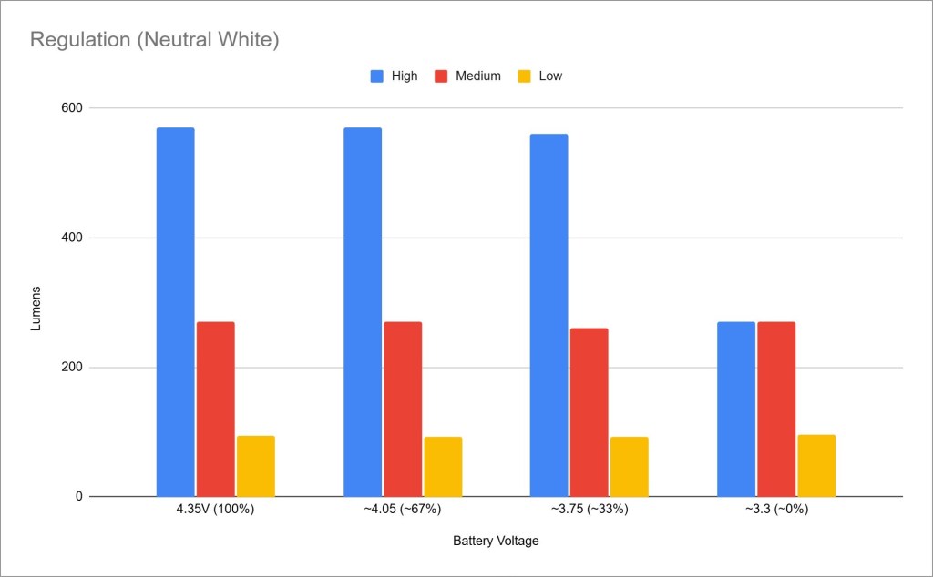 Regulation performance is good, average, and satisfactory on the optional rechargeable battery. It can reach peak brightness until the battery is virtually empty.