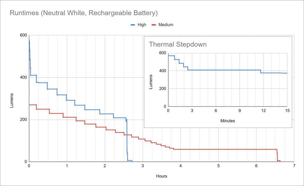 Thermal regulation: I didn’t do an active thermal regulation test because the light is made of plastic, a great insulator. I’m assuming the stepdown shown in High mode is timed.