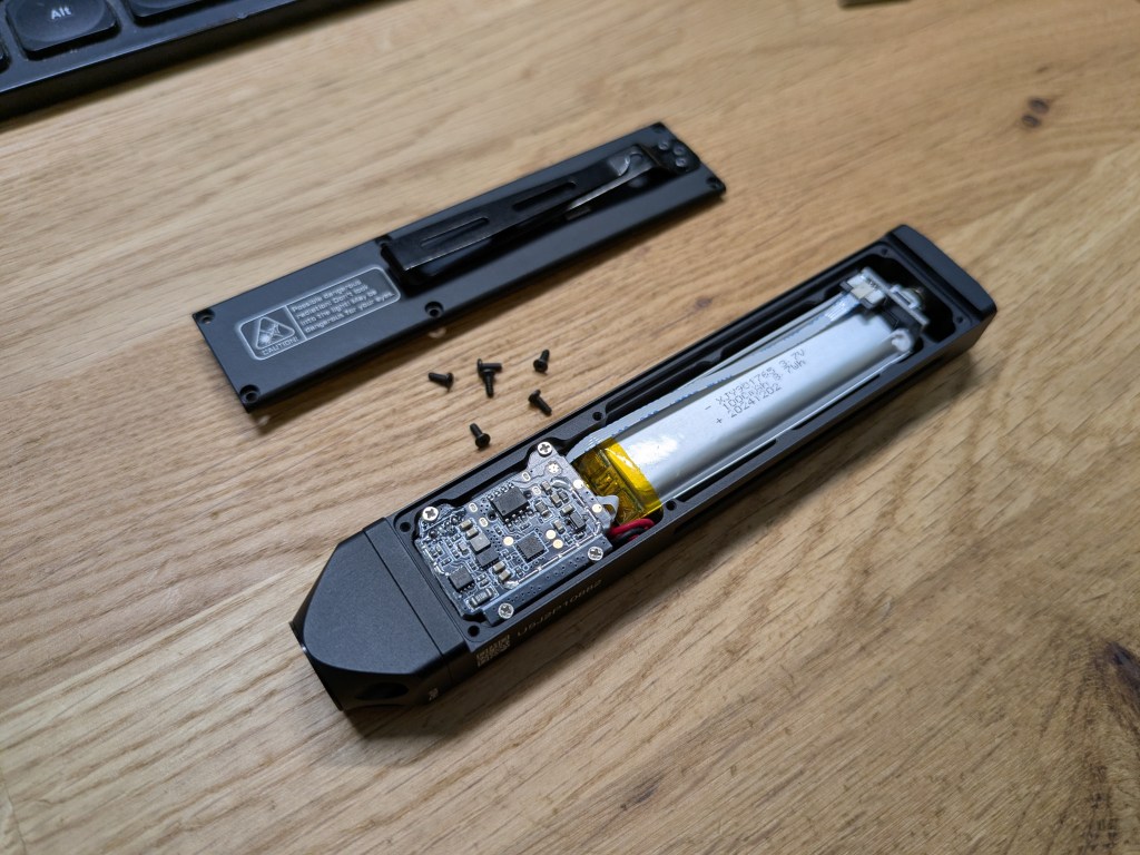 The battery is a built-in 1000mAh pouch cell. Unlike all other lights in this class, you can replace it when it eventually wears out! Doing so will probably void the warranty, but the warranty should expire long before the battery needs replacement (it’s 24 months on the battery, according to the included warranty card).