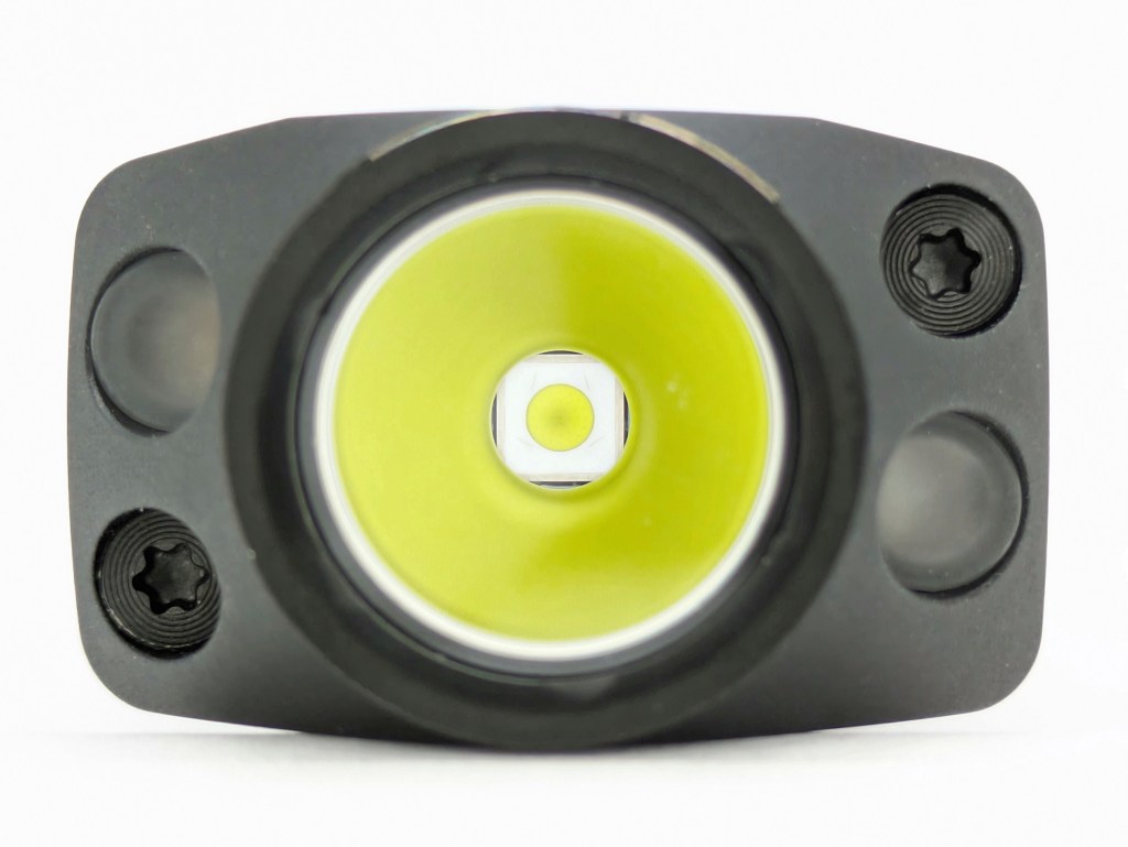 The main white LED is a Luminus SFT25R in 6500K, and it’s the perfect choice. It’s bright and intense, so it can generate respectable throw/candela from UC20’s small reflector. There are also red and UV secondary LEDs under two diffusers/optics.
