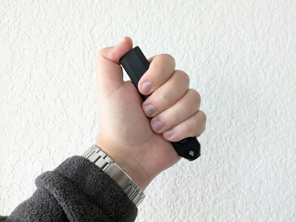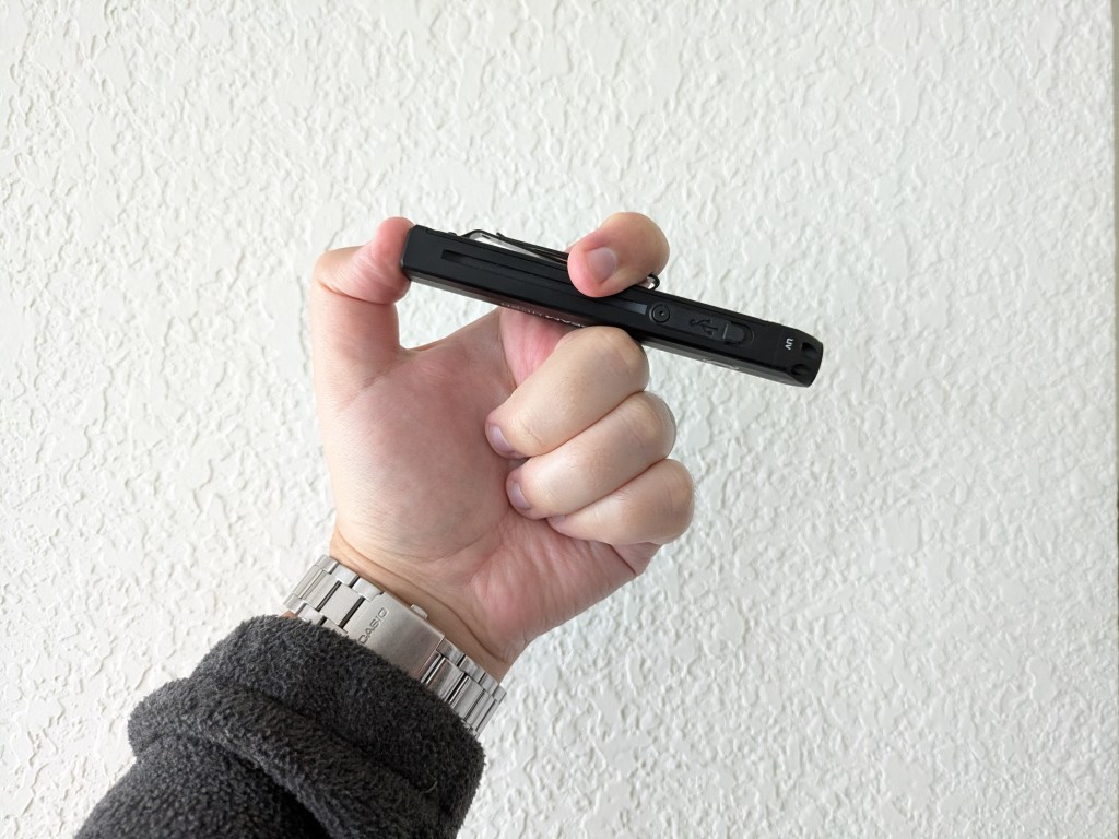Ergonomics are good. It’s comfortable in a forward grip when using the side switch, and reverse or cigar grip when using the tailswitch.