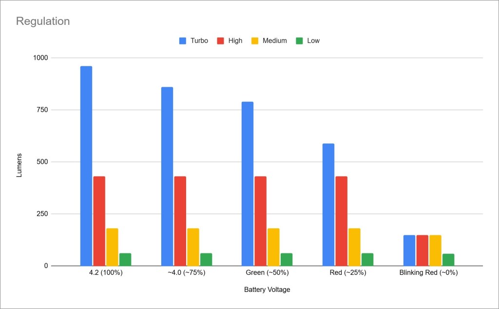Regulation performance is ok. It maintains most of the Turbo brightness down to ~50% charge, and all the other modes are flat down to 25% charge or less. A little bit better Turbo regulation would be nice but this isn’t bad. It’s certainly leaps ahead of the Olight Arkfeld series and Wurkkos HD01.