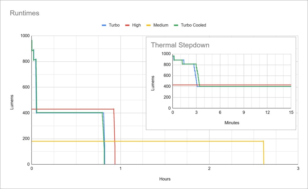 Disclaimer: All of my measurements are taken at turn-on. Lumen measurements were taken on a Texas Ace 3.5″ Lumen Tube. A candela measurement was taken at 10 meters with an Opple Light Master III on the highest brightness, and other candela figures were calculated relative to that. CRI, CCT, & DUV data were taken for each mode from a few feet away at the center of the hotspot with the Opple Light Master and Waveform DUV Calculator. Runtime tests were performed with the Ceilingbounce app on my smartphone. These tests were performed with a fully charged included battery unless otherwise specified. I cannot measure moonlight directly, so moonlight readings are calculated based on the brightness relative to the next-lowest mode. None of this is professional equipment, so take these measurements with a grain of salt.