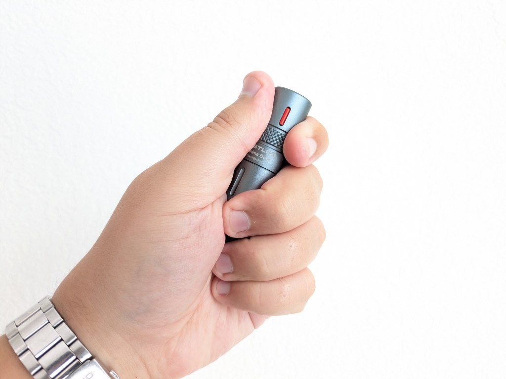 Ergonomics are ok. It’s a pretty small light but it’s comfortable enough to hold and point in a pencil or reverse grip. I can twist it with one hand in a forward grip, but it’s slow and clunky. In a cigar grip, with it just loose enough to be off, I can press on the tail to make it turn on and treat it like a momentary switch.