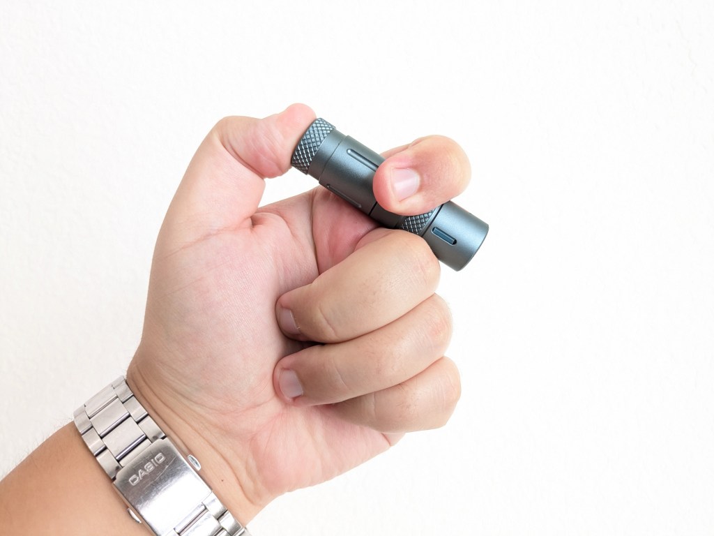 It’s a twisty! It’s the only twisty LEP I’m aware of, in fact. That’s partially why it’s so small, because there’s no switch to take up space. The twist mechanism is pretty stiff so it won’t turn on in your pocket, but it’s difficult to twist with one hand. If you want, you can treat it like a momentary tail switch and hold it in a cigar grip, as shown below.