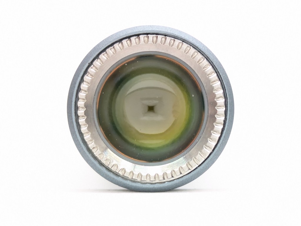 This is an LEP flashlight rather than an LED flashlight. LEPs shine a blue laser at a yellow phosphor layer to produce an extremely intense bright spot, then project that bright spot through the aspheric lens at the front. That produces a pencil-thin and extremely intense beam with no spill.