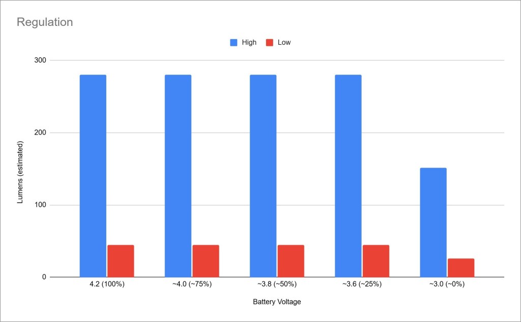 Regulation performance is good. It maintains most of the Turbo brightness down to ~25% charge, and all the other modes are flat down to 25% charge or less. That’s exactly what I want because it shows the components are high quality and they’re being pushed hard for great performance.