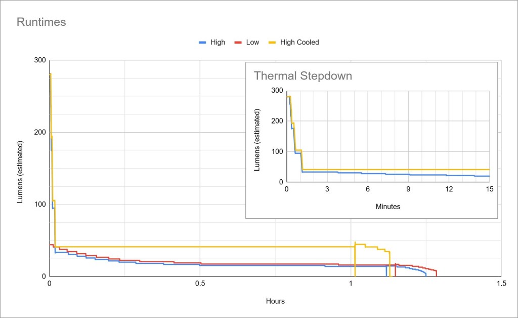 Performance (specifically brightness over time performance) isn’t great. High mode starts to step down after ~15 seconds and drops all the way down to Low mode by 1 minute. Low mode is not thermally sustainable and it slowly drops to a meager ~20lm after half an hour.