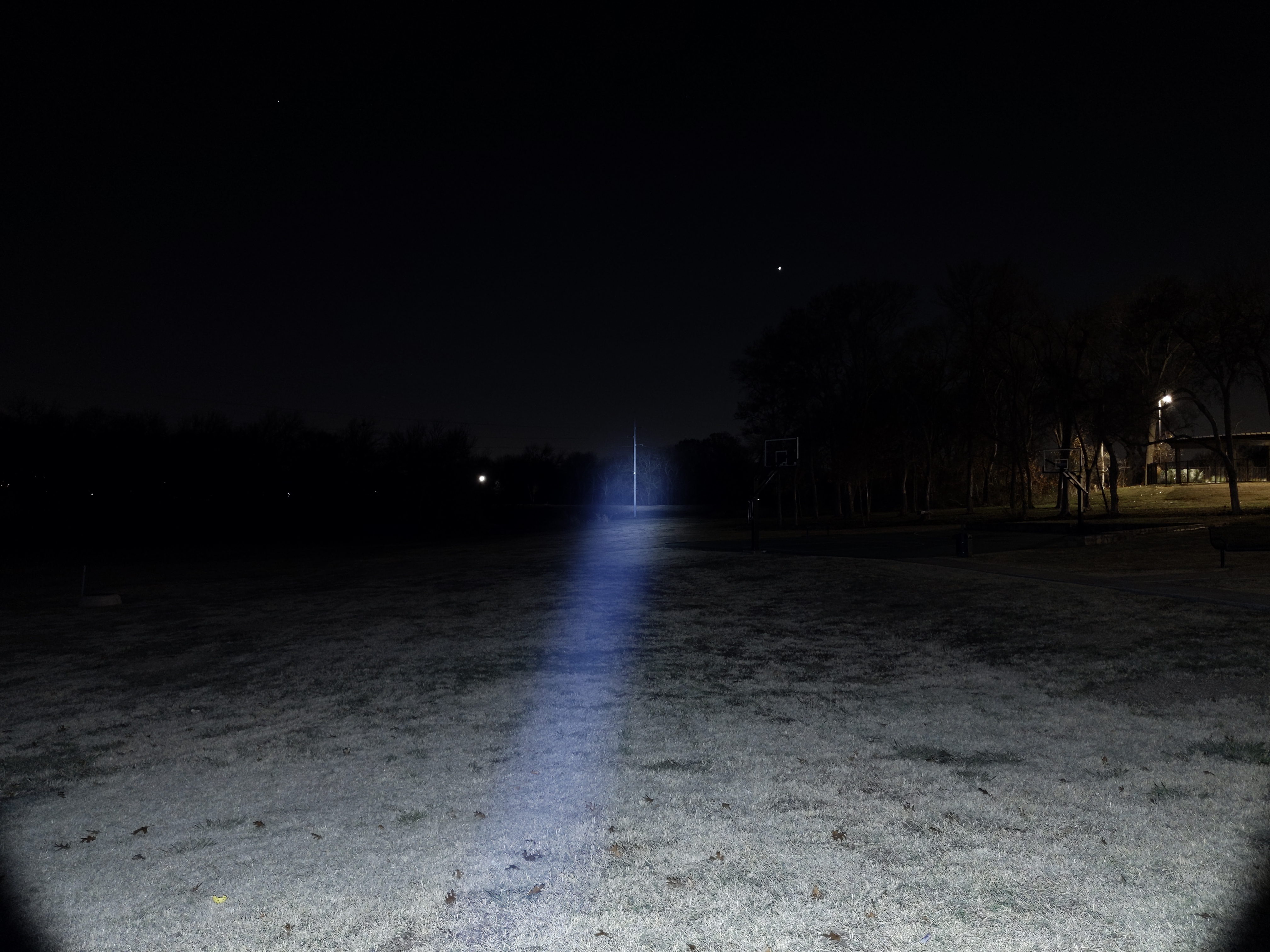 Disclaimer: All of my measurements are taken at turn-on. My Lumen Tube doesn’t measure super-intense lights like this accurately, so I’m just quoting the official maximum lumen spec below. A candela measurement was taken at 10 meters with an Opple Light Master III on the highest brightness, and other candela figures were calculated relative to that. CRI, CCT, & DUV data were taken for each mode from a few feet away at the center of the hotspot with the Opple Light Master and Waveform DUV Calculator. Runtime tests were performed with the Ceilingbounce app on my smartphone. These tests were performed with a fully charged included battery unless otherwise specified. I cannot measure moonlight directly, so moonlight readings are calculated based on the brightness relative to the next-lowest mode. None of this is professional equipment, so take these measurements with a grain of salt.