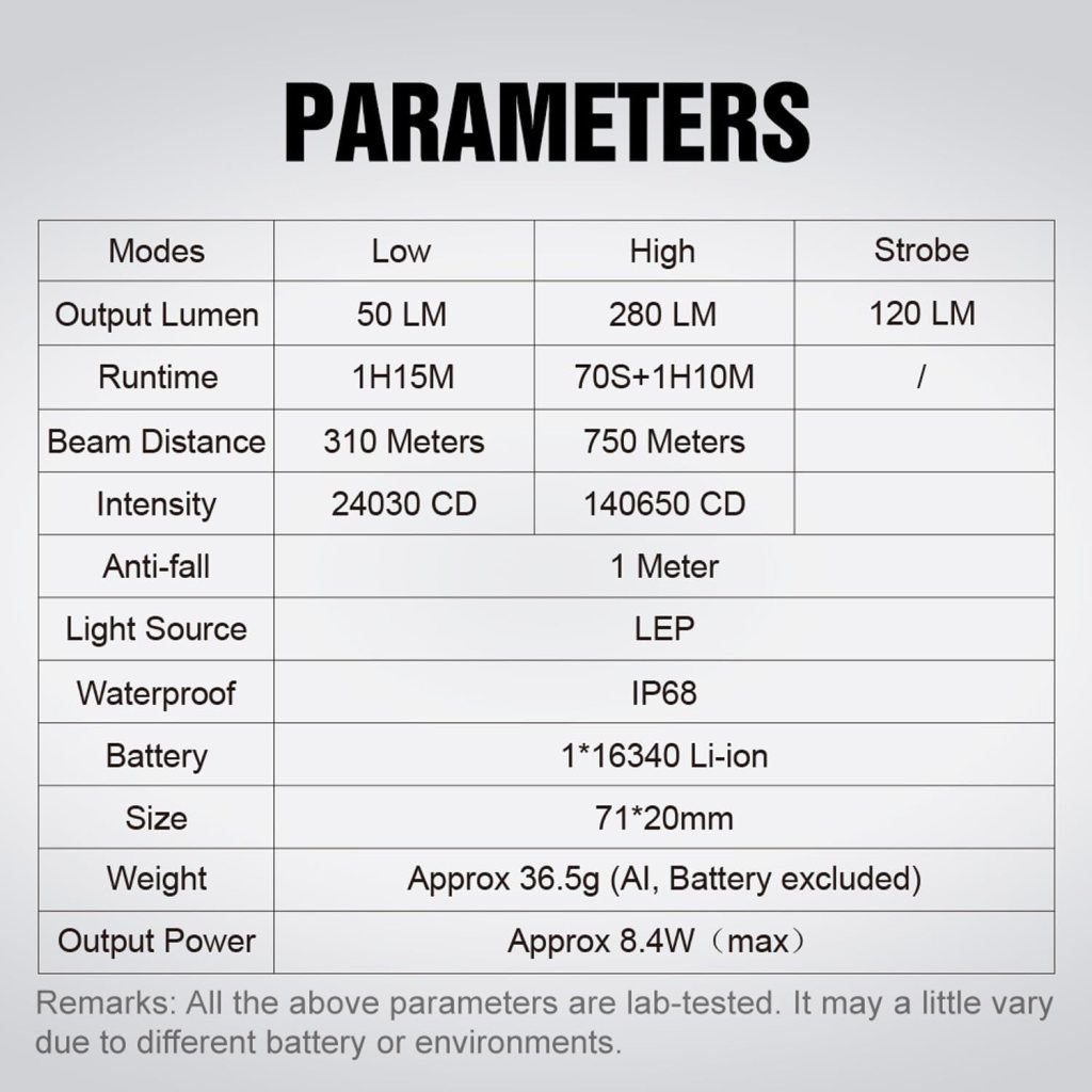 The battery included is an 850mAh, USB-C rechargeable, protected, button-top, 16340 cell that does the job just fine. The spring in the tail is quite long so unprotected flat top cells should work just fine. I briefly tried a CR123A also and that it worked, though CR123A compatibility isn’t officially mentioned anywhere and LVP may shut the light off before a CR123A is empty. There is no battery indicator on the light.