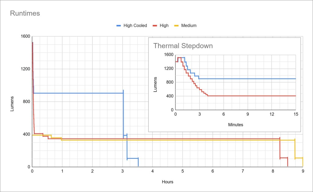 Thermal regulation: My Turbo Cooled test shows a significant increase in sustained brightness, meaning this light has active thermal regulation that will adjust brightness to give you maximum performance without overheating.