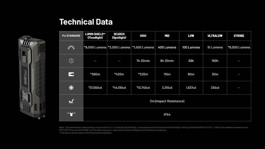 Disclaimer: All of my measurements are taken at turn-on. Lumen measurements were taken on a Texas Ace 3.5″ Lumen Tube. A candela measurement was taken at 10 meters with an Opple Light Master III on the highest brightness, and other candela figures were calculated relative to that. CRI, CCT, & DUV data were taken for each mode from a few feet away at the center of the hotspot with the Opple Light Master and Waveform DUV Calculator. Runtime tests were performed with the Ceilingbounce app on my smartphone. These tests were performed with a fully charged included battery unless otherwise specified. I cannot measure moonlight directly, so moonlight readings are calculated based on the brightness relative to the next-lowest mode. None of this is professional equipment, so take these measurements with a grain of salt.