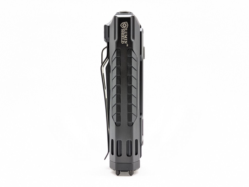 The flat rectangular switch is the instant Turbo/Strobe/Luminshield switch. It’s momentary only, so releasing it will turn the light off. It’s two-stage, so a half press activates Turbo and a full press activates Strobe or Luminshield. I love having a dedicated Turbo switch that makes it instantly accessible. I also love that I can choose between Turbo+LumenShield, Turbo+Strobe, or just Turbo.