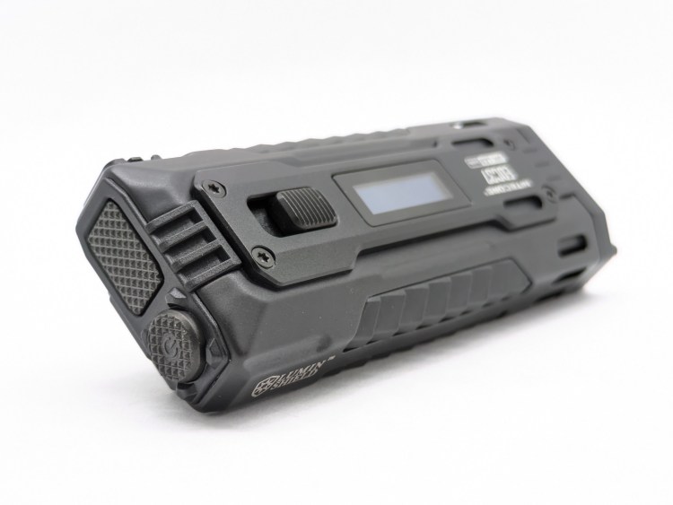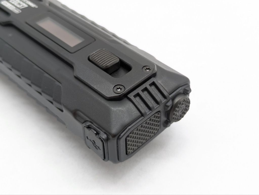 A unique feature of most of Nitecore’s flat lights is the small OLED display. It displays battery voltage, brightness level, remaining runtime at that brightness level, and lockout status. The display turns on for a few seconds after you press a switch. You can turn it on to check battery status or adjust brightness while the light is off by half-pressing the main switch. Half-pressing again will cycle the brightness level so you can turn the light on in any mode you want.