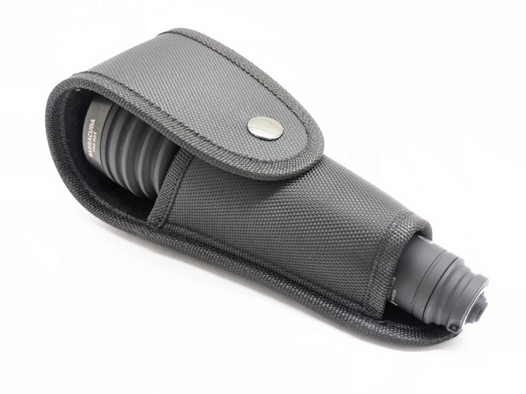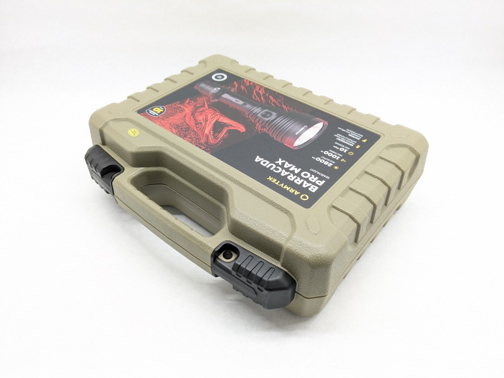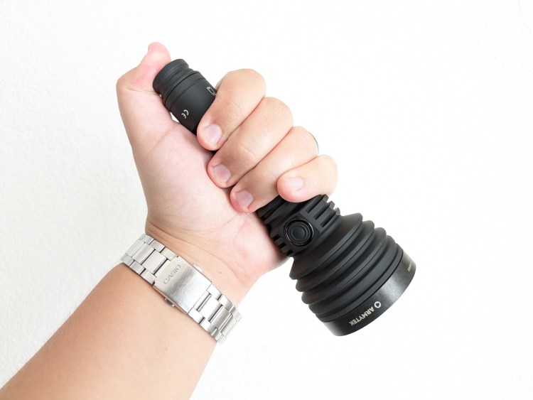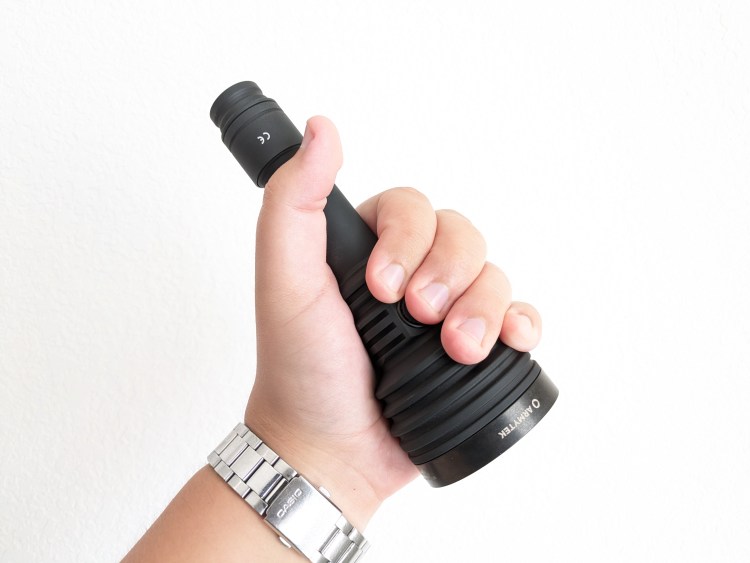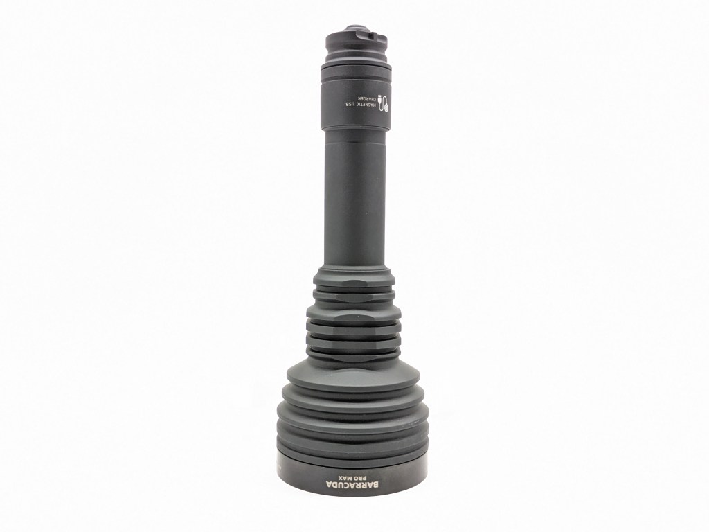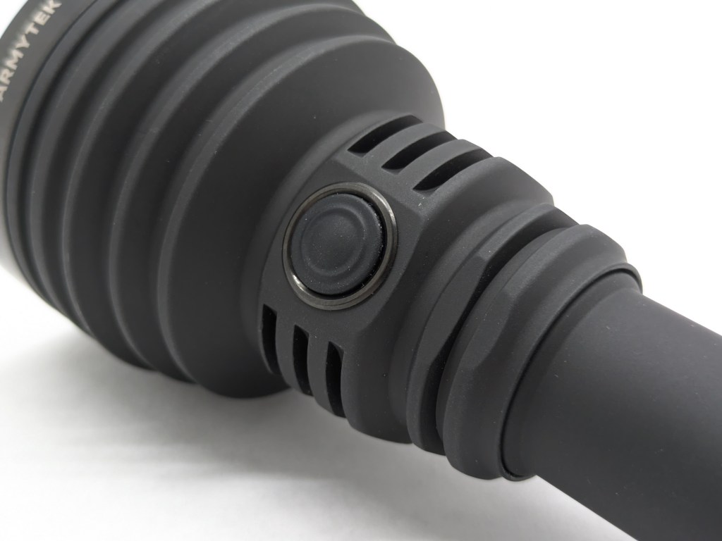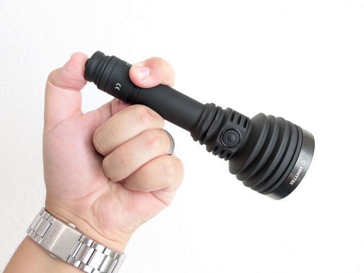 Barracuda Pro Max has a fairly traditional flare-head single-cell thrower shape. However, instead of milling texture into the body tube for grip, Armytek left it smooth and finished the whole light in their grippy chalkboard anodizing. The bezel and switch retaining ring are blackened steel. I think it looks smart.