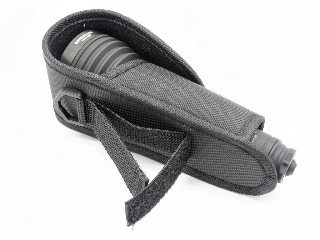 The holster is relatively rigid and made of nylon. The closure is a snap and there are two belt loops. One is fixed, and the other can be opened with Velcro.