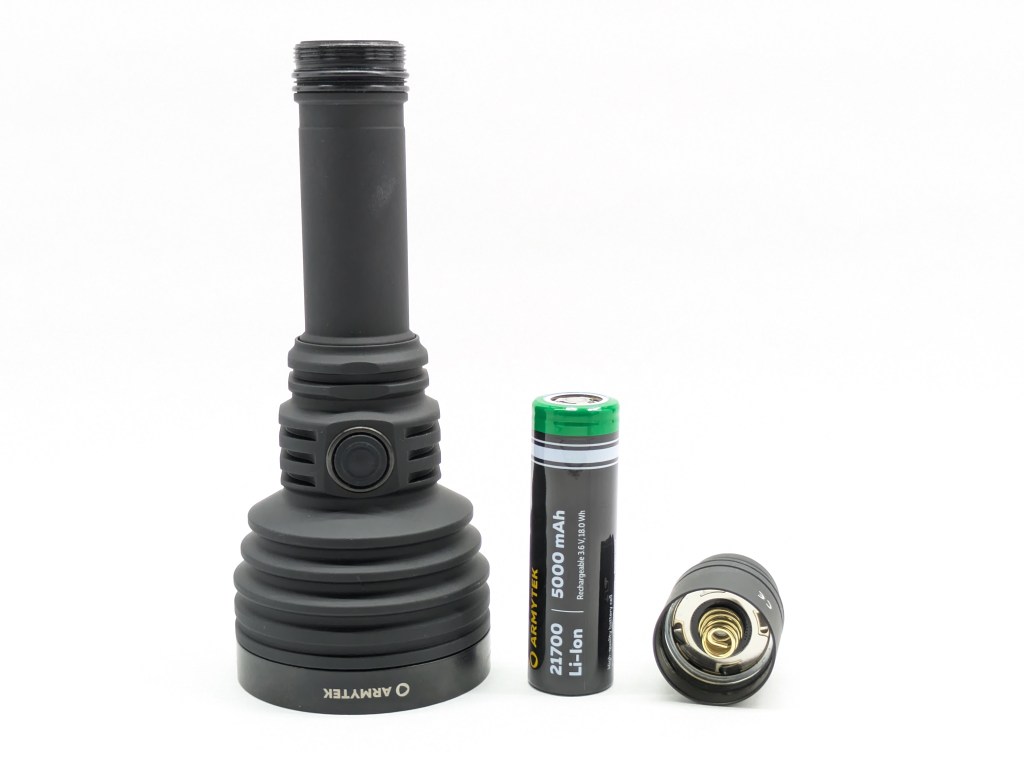 The battery included is an Armytek-branded, unprotected, flat-topped, 5000mAh, 21700 cell. Protected 21700s fit and work fine, as do two CR123AS, or a single protected/unprotected 18650. There’s a spacer included for using CR123As or 18650s. If you use CR123As, they cannot be recharged.