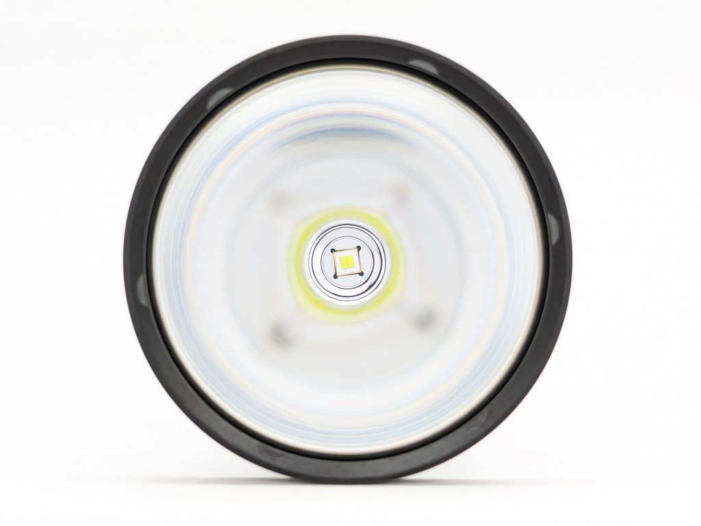 This light uses a Luminus SFT70 cool white LED. I like SFT70 because it’s bright, throws well, and necessitates a boost driver with a single cell. Most SFT70 lights have good drivers for that reason. The LED sits at the bottom of a deep, smooth reflector.