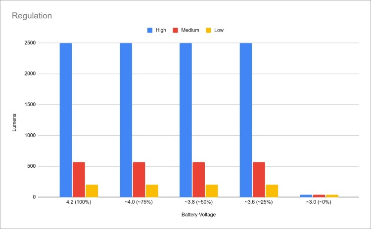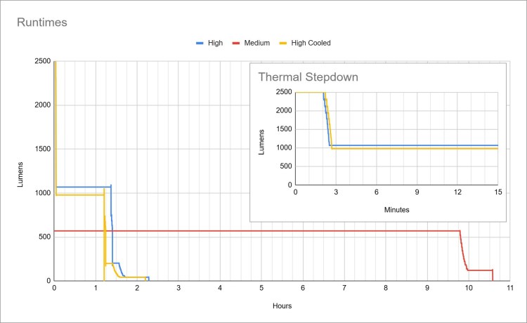 Performance is great. Two minutes of Turbo Time is respectable. Over 1000lm sustained is great, and about what I expected. Total runtime is also good, and I’m pleased with how flat the runtimes are.