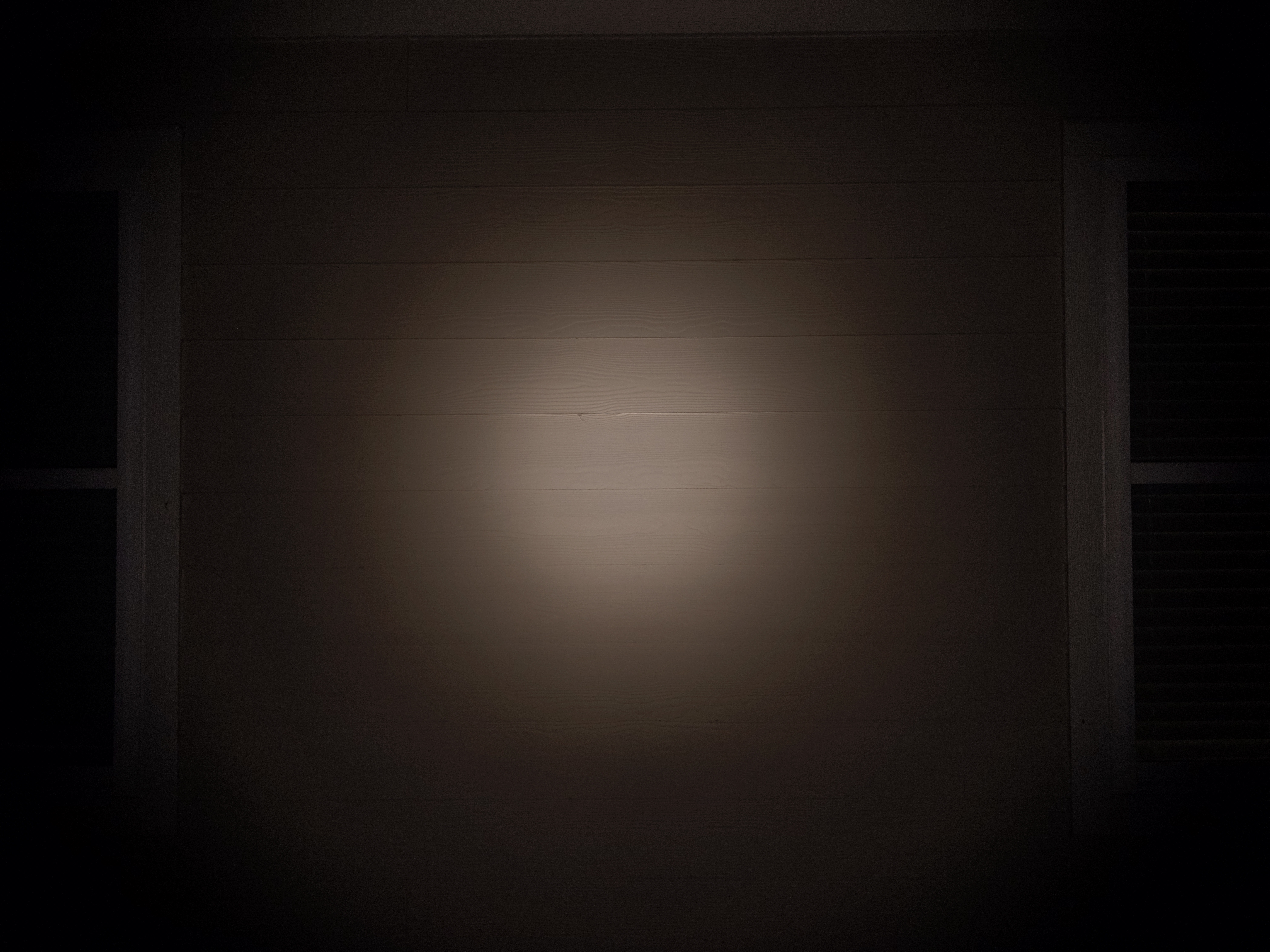 The beam is floody with a wide hotspot and spill that fades gradually away from the hotspot. It’s great for up close or flooding a room, but it doesn’t throw far.