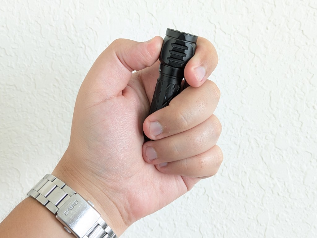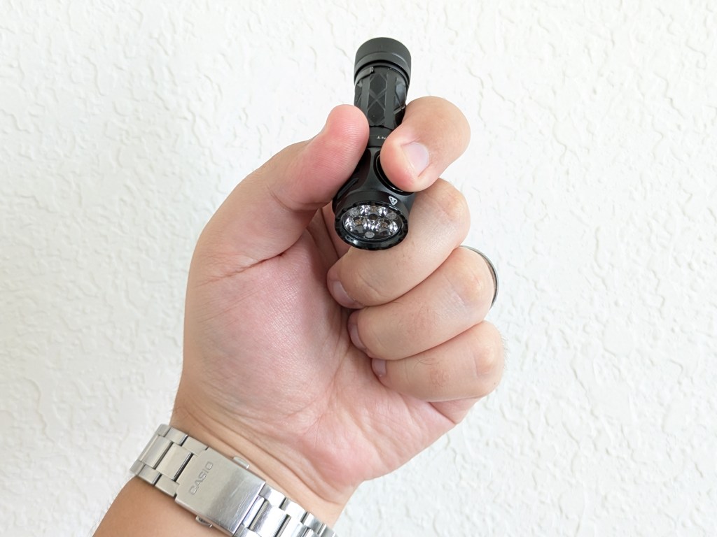 Ergonomics are decent. It’s a small light, but with the clip installed I can get a good 2-3 finger grip on it with my thumb on the button. Pencil grip works well too.