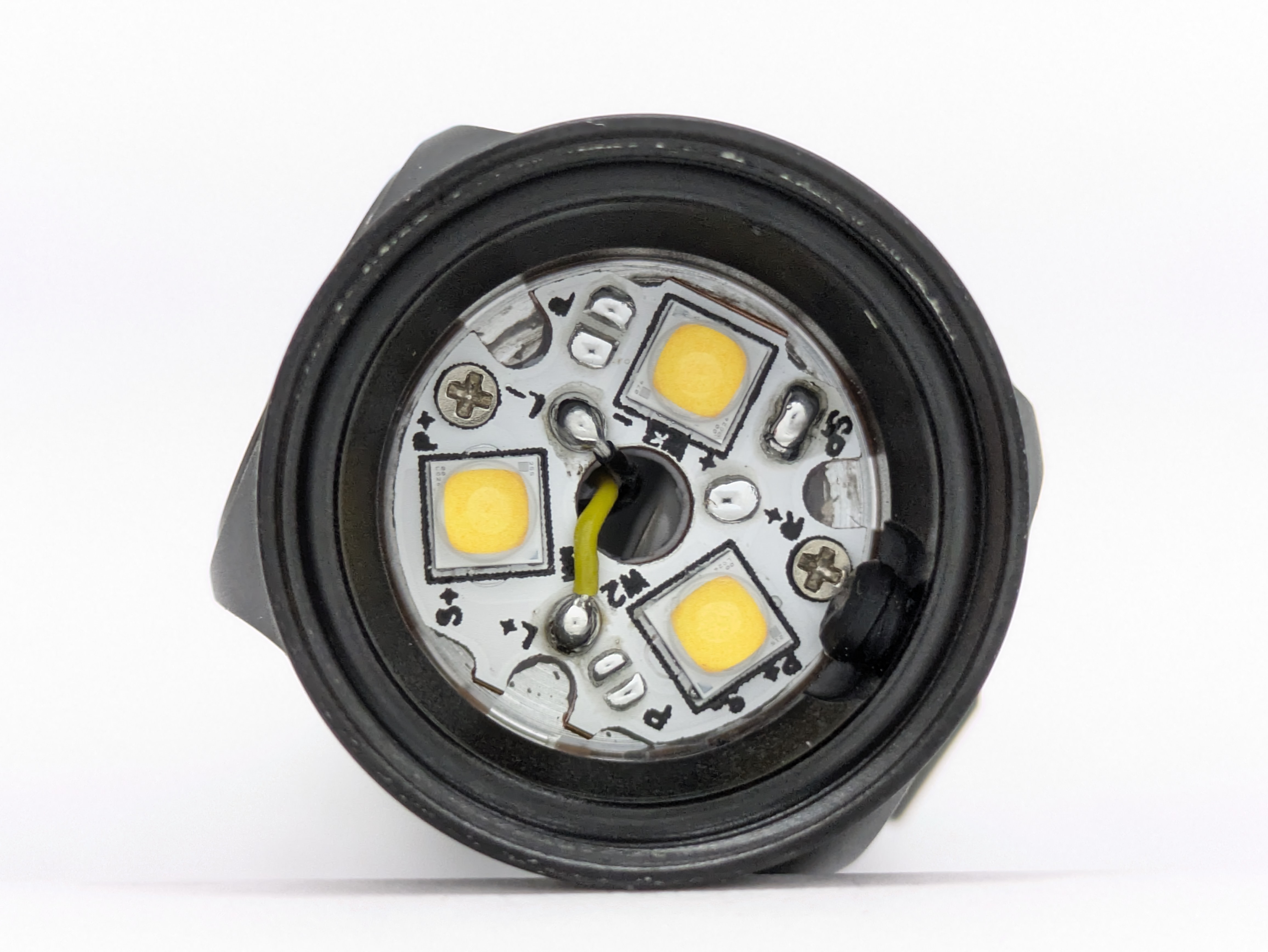 EC150 uses three LEDs under a TIR optic. The two LED choices are Nichia 519A 4500K (shown here, for the best colors and wider beam) or Luminus SFT25R Cool White (for worse colors but more throw). The power wires to the MCPCB are quite small, but that’s OK because the LEDs are in series, not parallel.