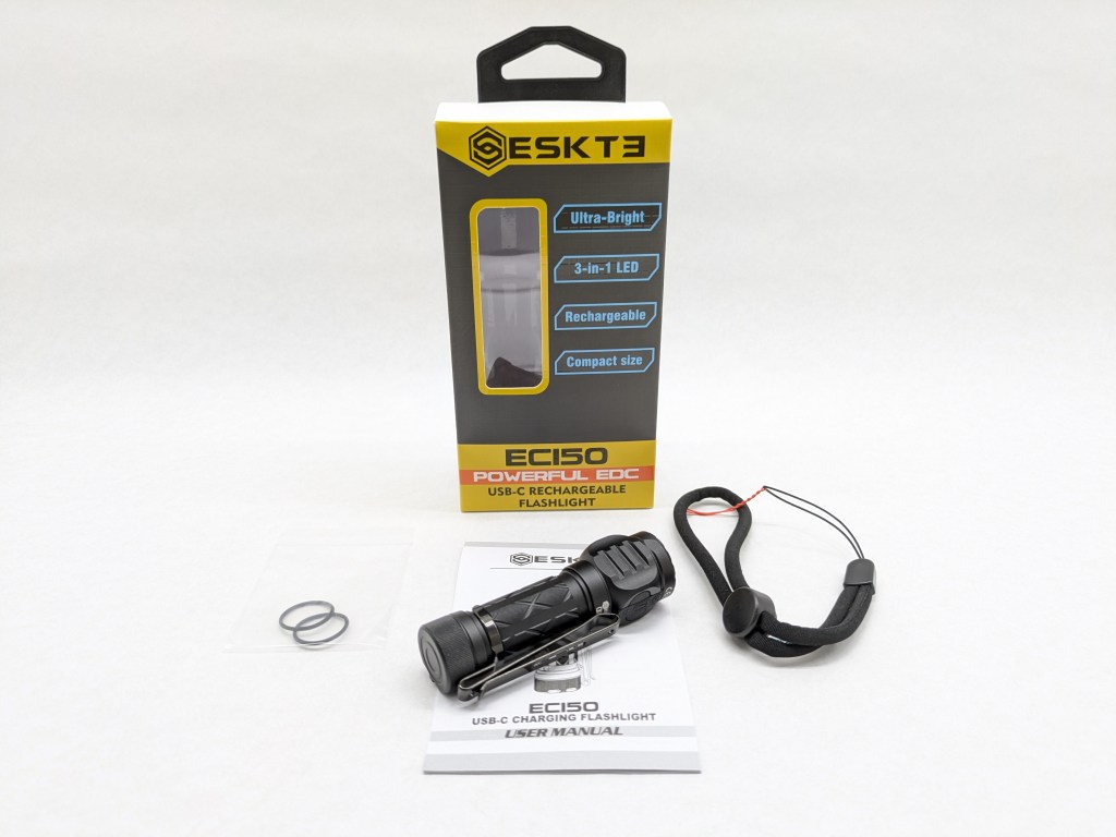 EC150 comes in Skilhunt/ESKTE’s standard retail box. A window shows the light inside and a sticker specifies the LED. Inside is: