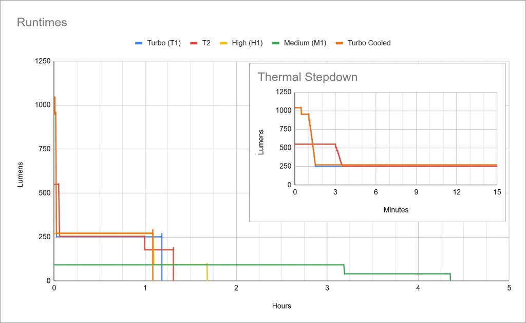 Disclaimer: All of my measurements are taken at turn-on. Lumen measurements were taken on a Texas Ace 3.5″ Lumen Tube. A candela measurement was taken at 10 meters with an Opple Light Master III on the highest brightness, and other candela figures were calculated relative to that. CRI, CCT, & DUV data were taken for each mode from a few feet away at the center of the hotspot with the Opple Light Master and Waveform DUV Calculator. Runtime tests were performed with the Ceilingbounce app on my smartphone. These tests were performed with a fully charged included battery unless otherwise specified. I cannot measure moonlight directly, so moonlight readings are calculated based on the brightness relative to the next-lowest mode. None of this is professional equipment, so take these measurements with a grain of salt.