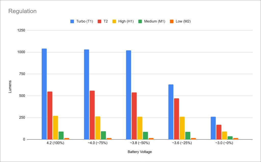Regulation performance is bit below average. It maintains full Turbo brightness down to ~50% charge, but Turbo is noticeably dimmer at ~25% charge and below.