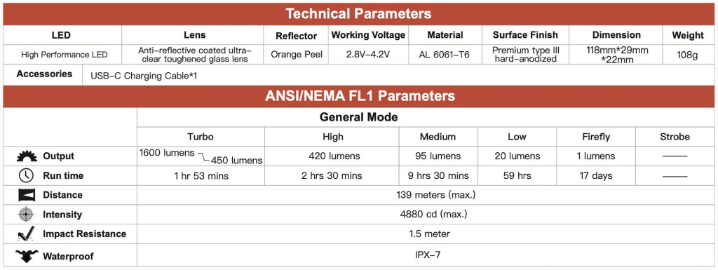 Performance: Peak and sustained brightness are in line with most other lights in this class. Runtime is similar to Olight Arkfeld Pro/Ultra and Jetbeam E26, but better than Wurkkos HD01 and Acebeam UC20.