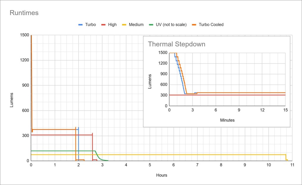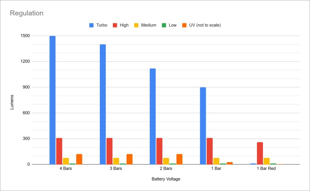 Regulation performance is below average but not bad. Turbo is affected by battery voltage but the rest of the white modes aren’t. UV is unaffected down to 2 bars. Ostensibly that’s 50% charge, but I don’t think the battery indicator is calibrated very well and 2 bars is closer to 25% charge. More on that in the next section.