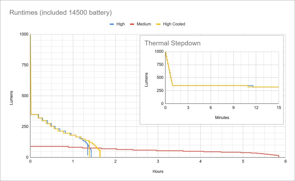 Performance is mediocre. Peak brightness is good but it starts stepping down immediately, and the rest of the runtime is unregulated and trends downward. Total runtime is good. UV always shuts off after 2 minutes.