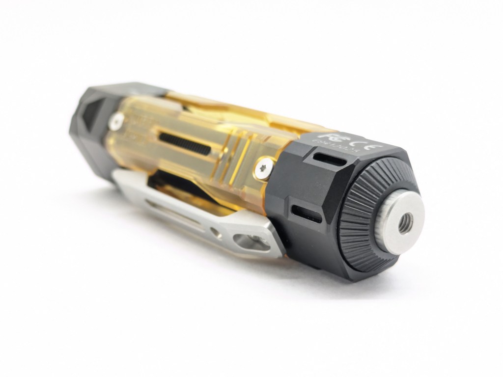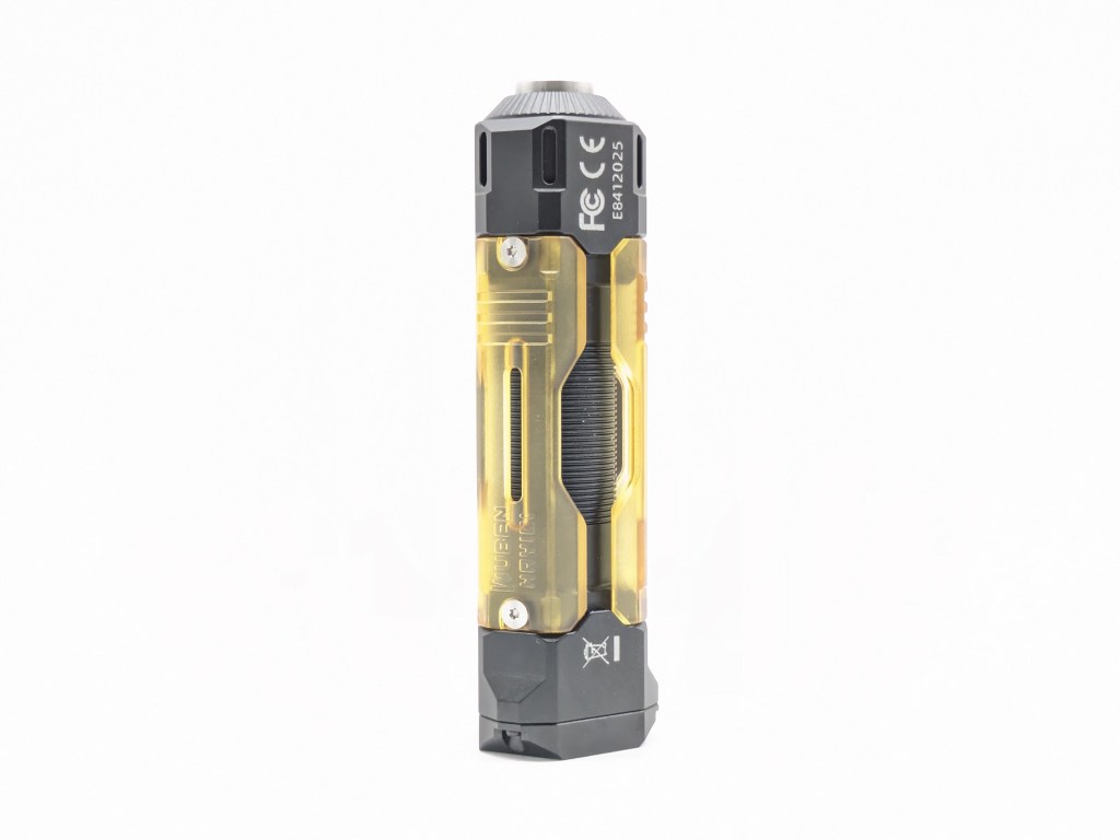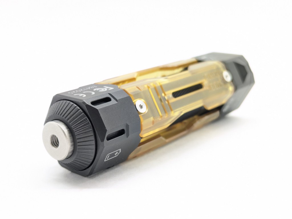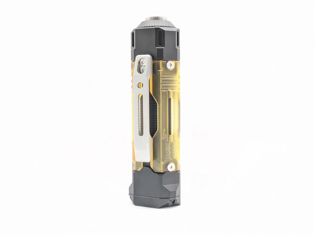 The design is the stand-out feature here. It’s striking and modern with translucent plastic scales that can be changed out for customization, like pocket knife handle scales. Other colors will be available from Wuben, and in the final version they’ll be held on with magnets instead of screws. The button is M4 threaded so you can add accessories there too, and there are plenty of tritium/glow slots.